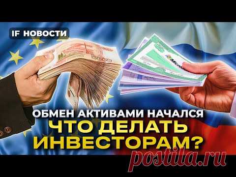 На изображении представлены руки двух людей, обменивающихся деньгами в виде евро и другой валюты. В фоне изображен флаг Европейского союза и некоторый текст на русском языке: "ИФ новости", "Обмен активами начался", "Что делать инвесторам?" и "postila.ru", что указывает на финансовую или экономическую тематику, предназначенную для русскоязычной аудитории.