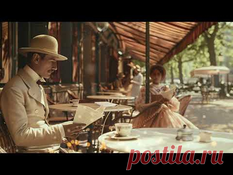 На изображении виден мужчина и женщина, находящиеся в кафе на улице. Мужчина в элегантном костюме и шляпе сидит за столиком и читает письмо. Женщина в винтажном платье сидит за соседним столиком и, кажется, отдыхает. Вся сцена выполнена в ретро стиле, что придает ей особый шарм.