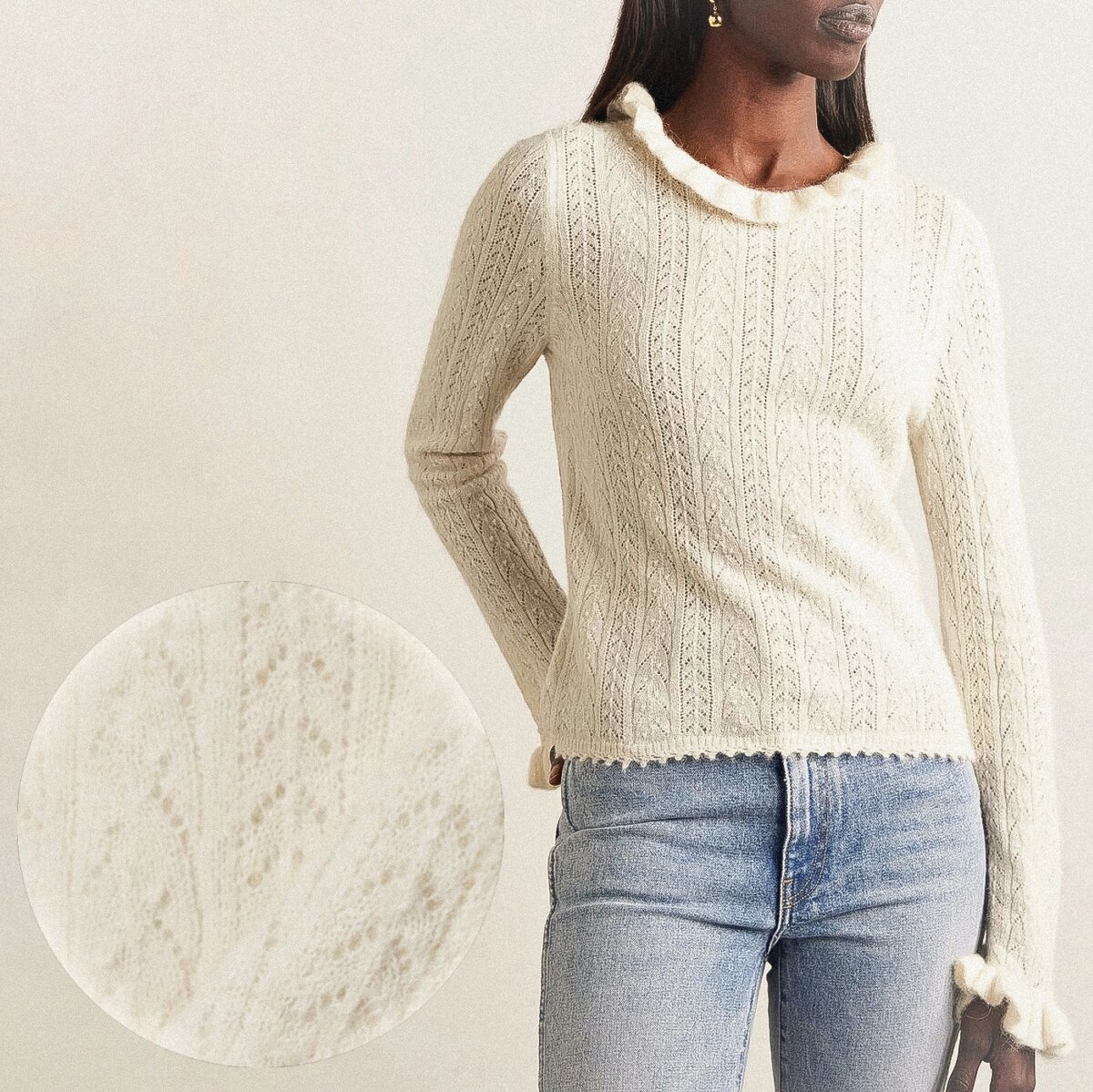 Невесомый ажурный джемпер с рюшами на горловине и рукавах (схема узора)
