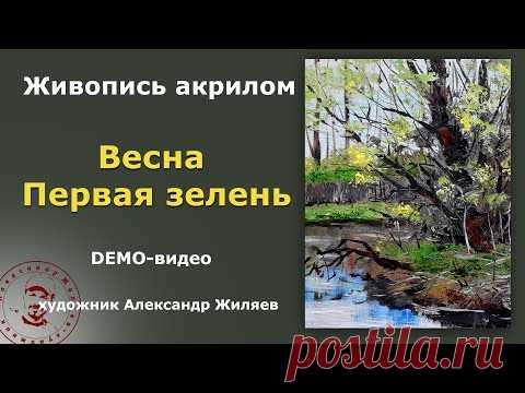 Изображение демонстрирует обложку видеоурока или демонстрационного видео по живописи акрилом. На обложке написано "Весна Первая зелень" и указано, что это "ДЕМО-видео". Также на обложке указано имя художника "Александр Южакев". Справа изображен художественный акриловый пейзаж, который, предположительно, является темой урока: весенний лес с первой зеленью и ручьем.