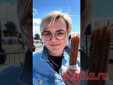 На фотографии изображен человек с короткими светлыми волосами и в очках, который улыбается и держит в руке какое-то угощение, похожее на сахарную вату или барбекю. Человек одет в джинсовую куртку и находится на фоне яркого дня на открытом воздухе, возможно, на каком-то мероприятии.