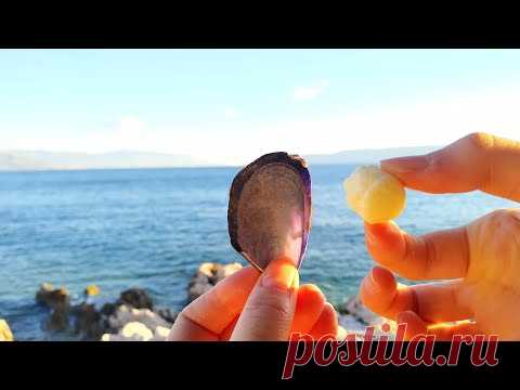 Человек держит в руках раковину и кусок хлеба на фоне морского пейзажа.