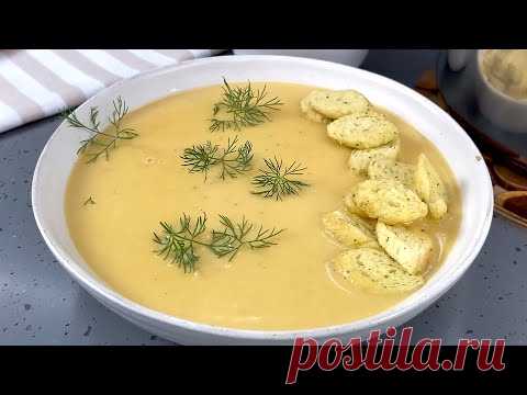 На изображении виден белый глубокий тарелке с крем-супом. Суп имеет гладкую консистенцию и окрашен в светло-желтый цвет. Сверху украшен зеленью укропа и несколькими кусочками поджаренного хлеба, положенными поверх. Фон изображения – серый стол с салфеткой в полоску.