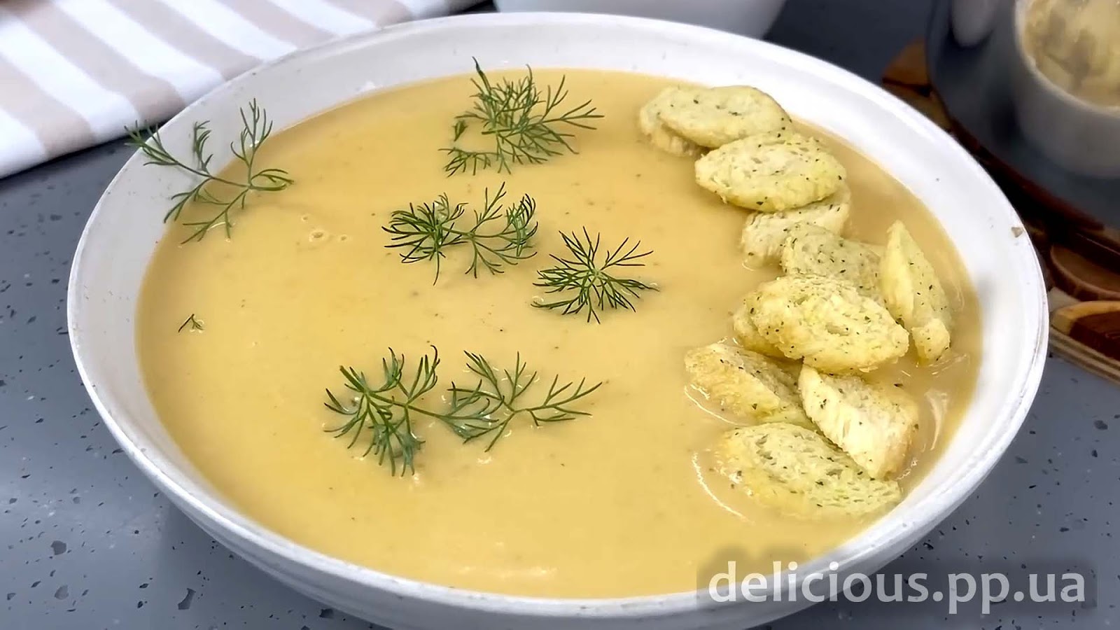 На изображении представлен тарелка с крем-супом, украшенная веточками укропа и гренками на одном боку. Суп имеет гладкую текстуру и однородный светло-желтый цвет.