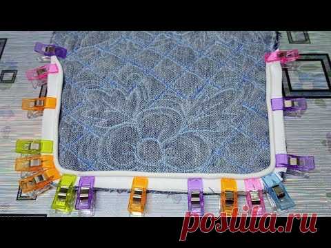 В этом изображении показано вышитое изделие, закрепленное на пяльцах с использованием разноцветных зажимов для белья. Изделие лежит на столе с покрывалом.