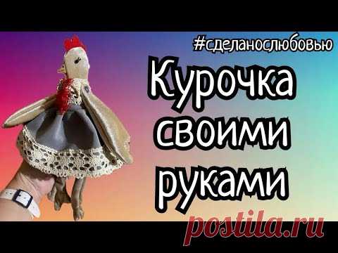 Изображение ручной работы игрушки в виде курочки, которая выглядит как сделанная своими руками, на фоне разноцветного градиента. На изображении есть текст: "#сделанослюбовью Курочка своими руками poshila.ru"