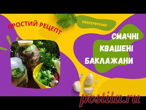 На изображении представлена рекламная графика с изображениями маринованных овощей. Фон ярко-желтый с фиолетовыми элементами дизайна, содержащими текст на русском языке, который гласит "Простой рецепт", "Консервируем!", "Смачні", "Квашені баклажани" и URL "positiv4ik.ru". В центре расположены три банки с маринованными баклажанами и зеленью.
