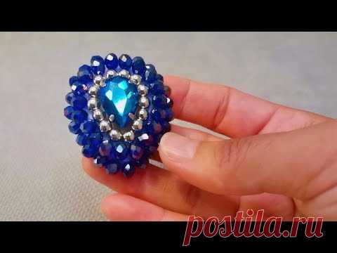 На изображении представлено кольцо с голубым камнем, украшенное синими бисерными лепестками, которое держат на пальце.