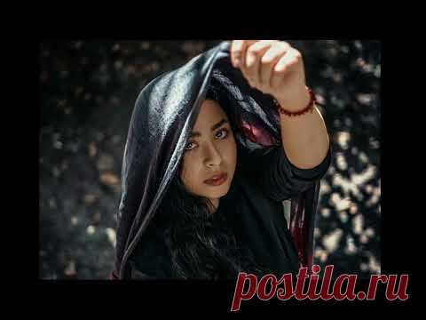 Женщина с темными волосами под черным капюшоном, смотрящая вверх. На фоне видны размытые блики.
