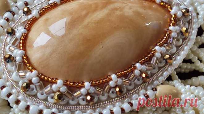 На изображении представлено украшение бижутерии с бисером, вероятно брошь или кулон. Центральным элементом является гладкий кабошон телесного цвета, окруженный аккуратно расположенным белым и золотым бисером, а также блестками или камнями меньшего размера.