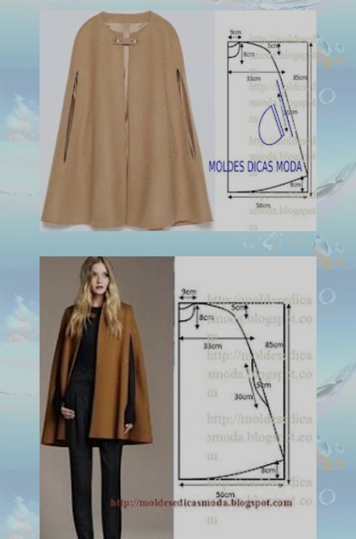 Коллаж изображений, включающий в себя фотографию женского плаща и сопроводительные выкройки одежды.