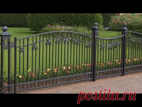 На изображении представлены кованые элементы черного цвета на металлических воротах. За воротами видна ухоженная зеленая лужайка и цветы.