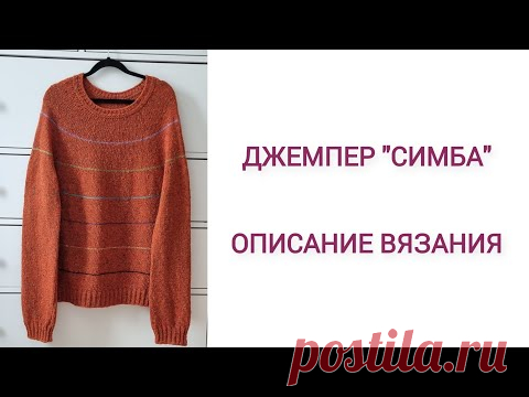 На изображении представлен джемпер кирпичного цвета с горизонтальными полосами. Джемпер висит на вешалке, и на нем размещены слова "Джемпер Симба" и "описание вязания". Фон за джемпером белого цвета.