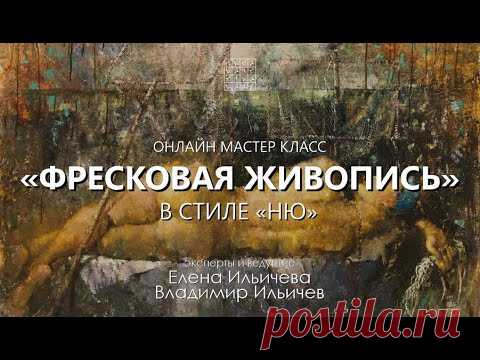 На данном изображении представлена реклама онлайн-мастер-класса по фресковой живописи в стиле "энкаустика". Внизу указаны имена преподавателей: Елена и Владимир Ильиных. Фон изображения имитирует текстуру живописи.