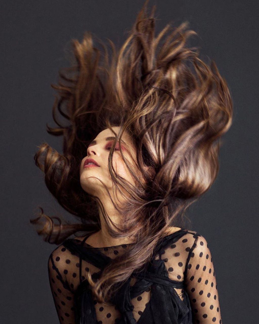 Женщина в черном наряде с прозрачными элементами с рисунком в виде точек. Она динамично двигает головой, в результате чего её длинные каштановые волосы поднимаются воздухом и создают впечатляющее облако вокруг неё. Фон изображения тёмный, что подчёркивает движение и текстуру волос.