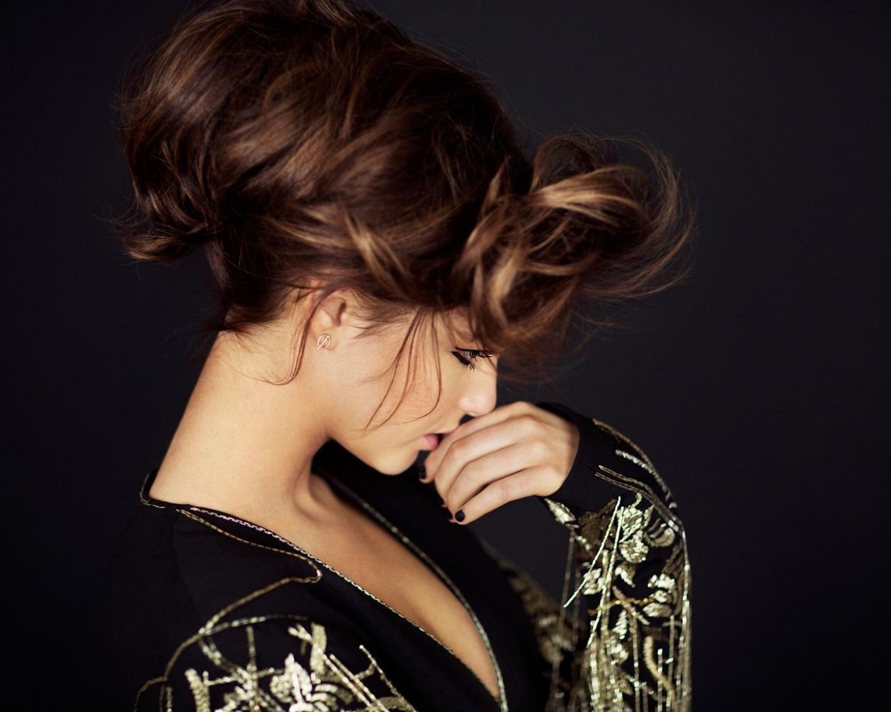 Женщина с нежным образом, сидящая в позе с опущенным взглядом, рука возле лица. На ней темный пиджак с золотым узором, и у нее красивая прическа с волнистыми волосами.