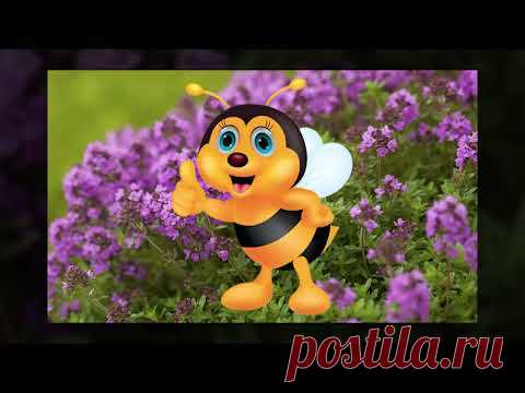 антропоморфный мультяшный персонаж-пчела на фоне фиолетовых цветов