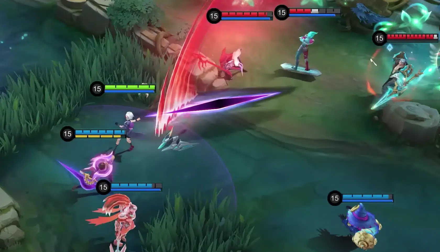 На изображении представлена сцена из компьютерной игры. Персонажи сражаются на виртуальной арене с использованием различных способностей. Боевые действия происходят в лесистой местности, а индикаторы здоровья над головами персонажей показывают текущее состояние их здоровья. В нижнем левом углу наложен водяной знак "positia.ru".