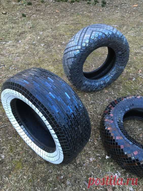 На изображении показаны три автомобильных шины, украшенные мозаикой. Они лежат на земле, покрытой сухой травой.