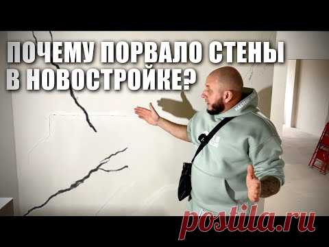Мужчина стоит внутри помещения с выражением удивления на лице, указывая на трещины в стене. Надпись на изображении на русском языке: "Почему порвало стены в новостройке?"