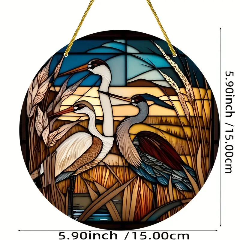 Круглое витражное украшение с изображением двух журавлей среди камыша и золотых камышей на фоне голубого неба. Изделие подвешено на золотистой веревке и имеет размеры, указанные снизу.