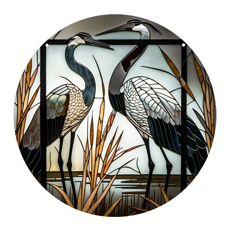 Изображение круглой витражной панели с изображением двух журавлей среди тростника.