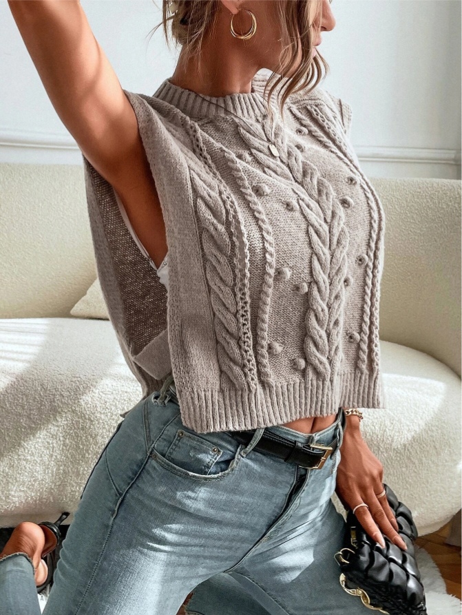 Женщина в модном вязаном свитере без рукавов и джинсах сидит на диване. Стильная одежда и аксессуары.