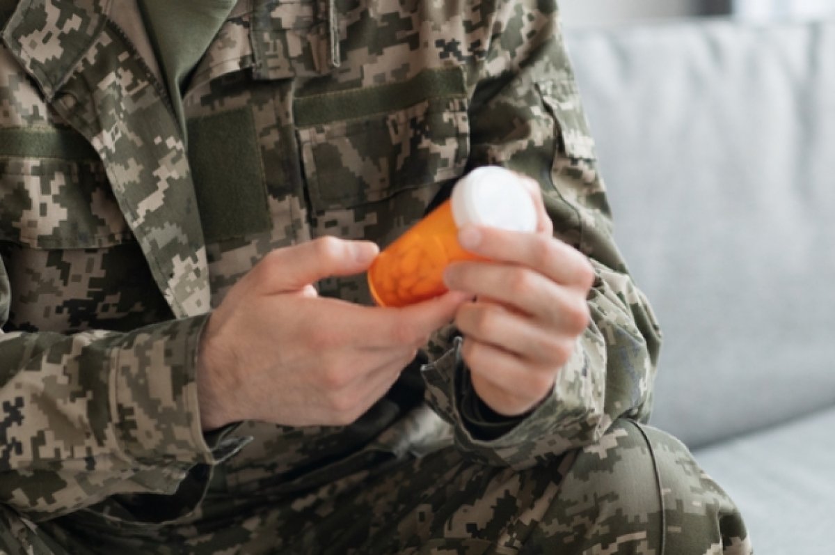 В изображении человек в военной форме держит бутылку с лекарством или витаминами. Видны только руки человека, который сидит и внимательно рассматривает содержимое бутылки.