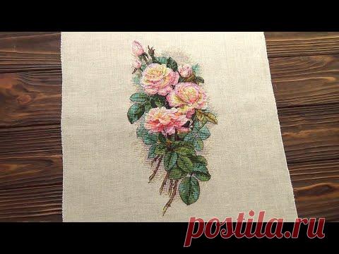 Изображение вышивки с букетом роз на бело-бежевом холсте, расположенном на деревянном фоне.