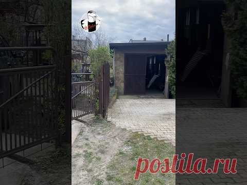 На изображении показан двор с кованым металлическим забором и калиткой. Поверхность двора выложена брусчаткой, а по краям видна зелёная трава. Вдалеке видна небольшая постройка, возможно гараж, с открытыми двойными дверями. Справа вверху постарадала спиральная металлическая лестница, ведущая на верхний этаж примыкающего здания.