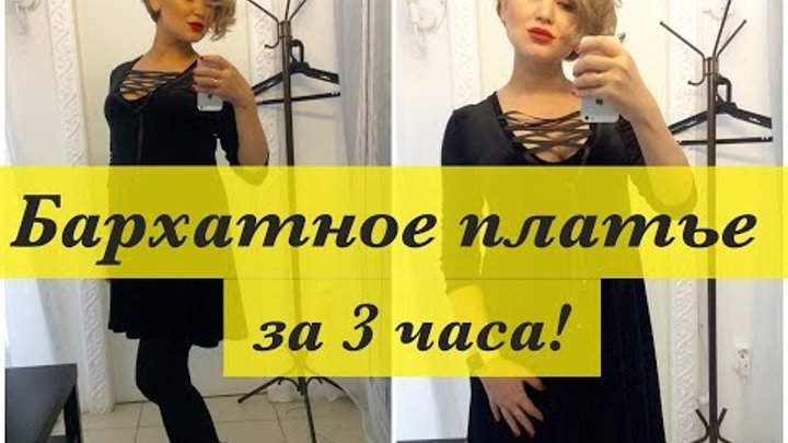 На изображении представлена женщина, позирующая в черном платье с декоративной шнуровкой на груди. Надпись на изображении гласит: "Бархатное платье за 3 часа!" и указывает на сайт postila.ru, который, возможно, предлагает инструкции или обучение по изготовлению одежды.