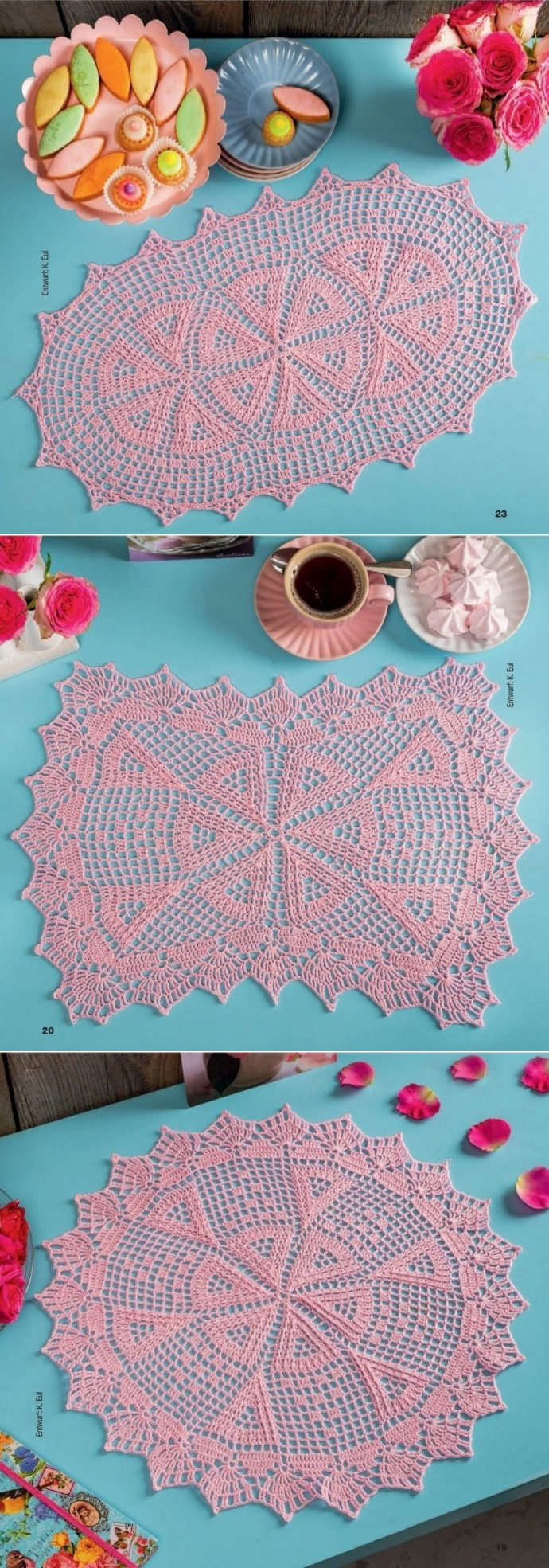 На изображении представлены вязаные крючком салфетки, расположенные на голубом фоне. В верхней части изображения находится тарелка с печеньем и чашка кофе, а также небольшое количество маршмеллоу. Рядом с ними расположен букет роз. В нижней части изображения видна открытка с цветочным узором. В центре фокуса находятся круглые розовые салфетки с красивым узором.
