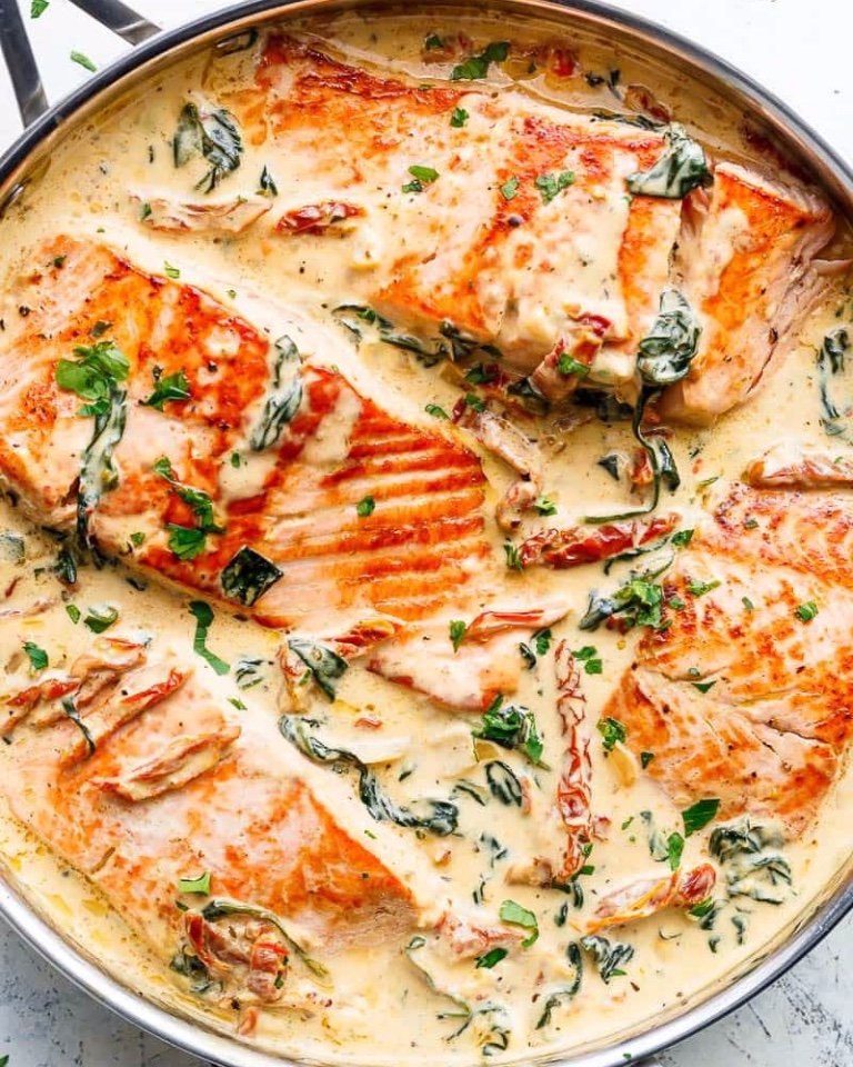 На изображении представлено блюдо, состоящее из кусочков жареного лосося, запеченного в соусе с добавлением зелени и специй. Лосось выглядит сочным и аппетитным, а соус, вероятно, кремовый, с добавлением трав и приправ.