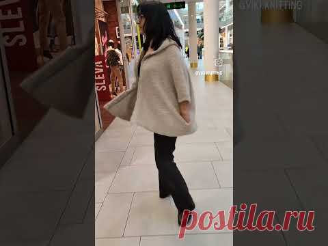 женщина идет по торговому центру, одетая в светлый пончо и черные брюки