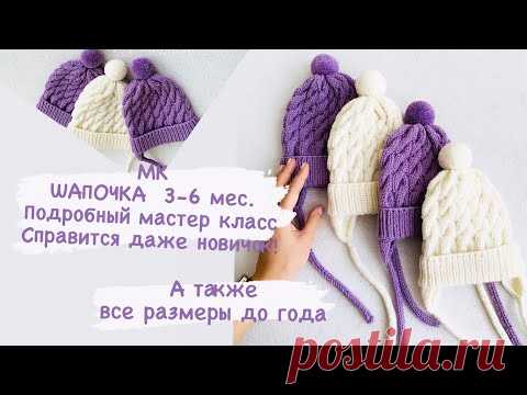 На изображении представлены вязаные шапочки разного размера, сопровождаемые текстом на русском языке, объявляющим мастер-класс по вязанию шапочек для возраста 3-6 месяцев и упоминающим размеры до года.