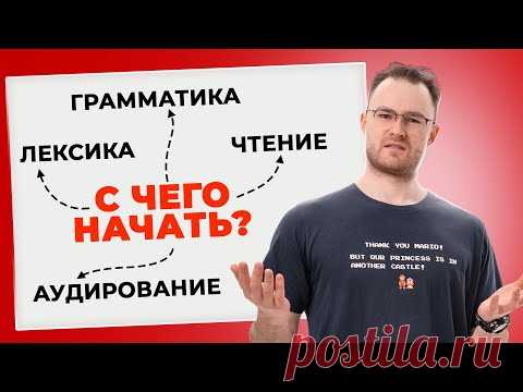 На изображении мужчина стоит перед красным фоном, указывая на плакат с написанным на русском языке текстом: "С чего начать?" и указателями к словам "Грамматика", "Лексика", "Чтение" и "Аудирование". Мужчина выглядит так, как будто он объясняет эти концепции или представляет учебный материал. На плакате текст и стрелки обрамлены пунктирными линиями, что предполагает наличие учебного или информационного контента.