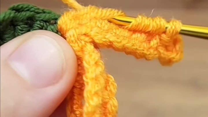 На изображении показан процесс вязания крючком. Виден кусок вязаной ткани желто-зеленого цвета и крючок, захватывающий рабочую нить. Рука человека держит вязание.