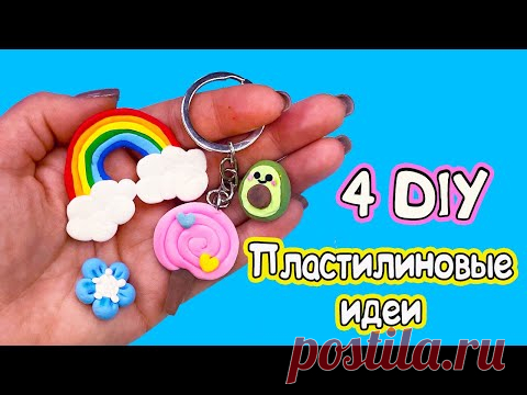 На изображении представлены четыре разноцветных поделки, сделанные своими руками из полимерной глины: радуга с облаками, авокадо, в Swirl и цветок. Все они собраны на брелок для ключей. Также имеется текст: "4 DIY Пластилиновые идеи postila.ru", предполагая, что это обучающий материал или руководство по ремесленному проекту.