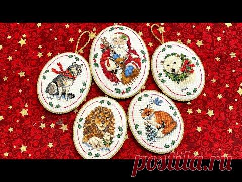 Изображены вышитые новогодние украшения на красной ткани с золотыми звездами. Украшения напоминают форму овала и украшены изображениями Санты, собаки, медведя, льва и лисы.