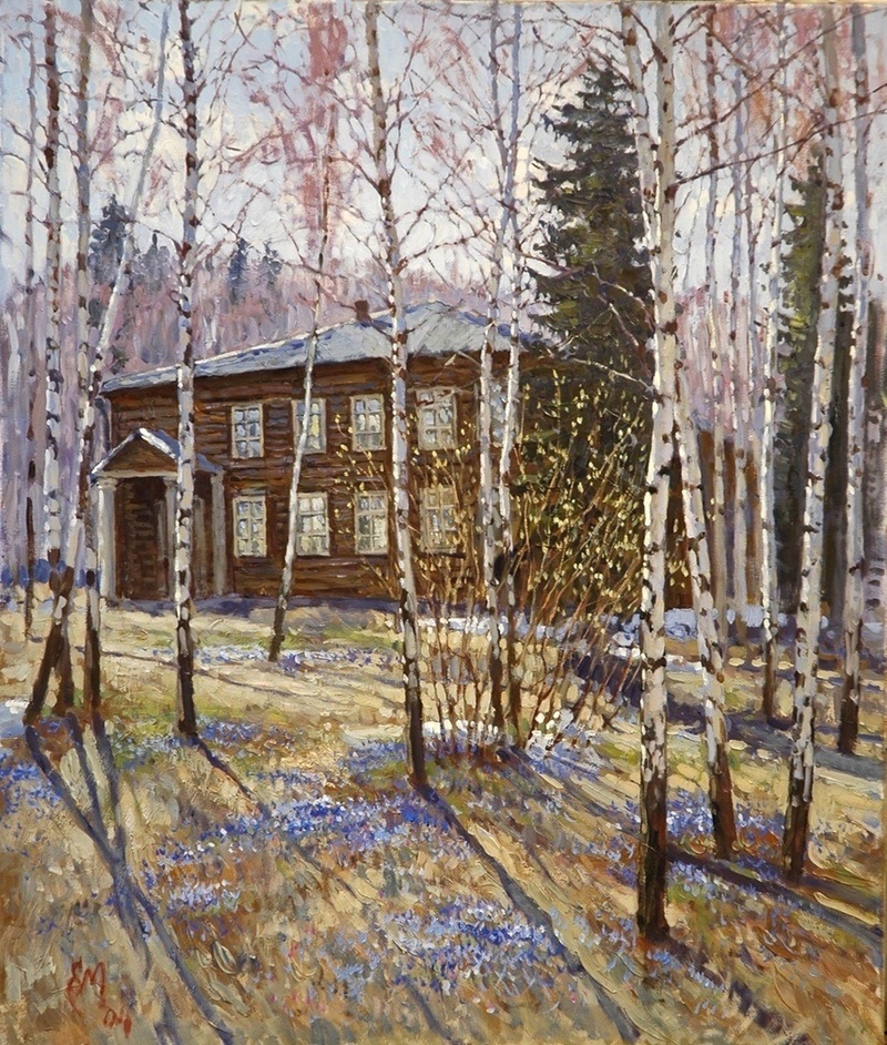 На изображении представлена живописная картина, изображающая деревянный дом среди берез весной. Свет солнца проникает сквозь ветви деревьев, создавая игру света и тени на земле, покрытой первыми весенними цветами и талым снегом.