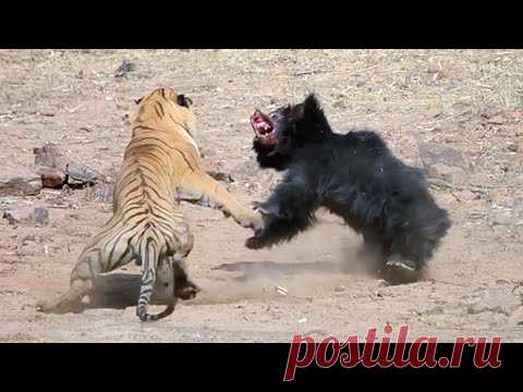 Изображение показывает столкновение тигра и черного медведя. Оба животных кажутся агрессивными и находятся в конфронтации, возможно на протяжении борьбы за территорию, пищу или доминирование.