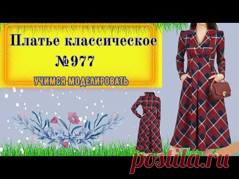 Изображение рекламы классического платья в клетчатый узор с номером модели 977. На картинке представлена манекен в платье, а также отдельное изображение такого же платья. Фон украшен цветами и снегом, а также логотипом веб-сайта.