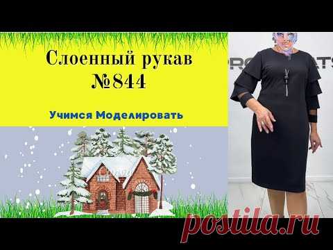 Изображение содержит комбинацию элементов, связанных с моделированием одежды. Слева расположен рисунок заснеженного домика, окружённого елями и снегом. Справа женщина позирует в черном платье с уникальным рукавом, возможно, это пример моделируемой одежды. Поверх изображения наложен текст "Слоенный рукав №844" и "Учимся Моделировать", указывая на обучающий характер контента.