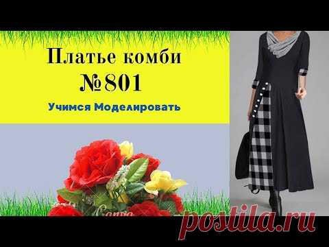 Изображение с рекламой платья кройки №801. На фото представлено женское платье черно-белого цвета с уникальным дизайном и аксессуарами. В нижней части картинки нарисован букет из красных и желтых цветов на зеленом фоне, а также присутствует текст: "Учимся моделировать".