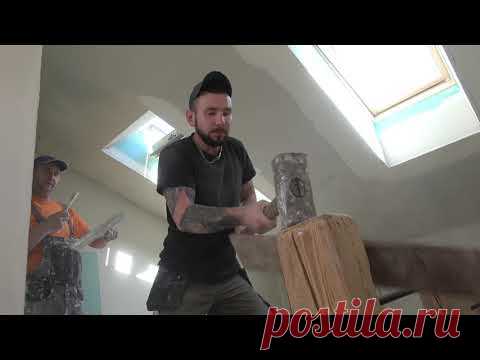 На фотографии изображены два человека, вероятно, рабочие занимающиеся ремонтом внутри комнаты. Один из них с бородой, в шапке и татуировками на руках, работает с деревянной балкой. Второй человек немного размыт на заднем плане, в рабочей одежде, держит в руке инструмент. Интерьер указывает на то, что помещение находится в процессе ремонта или строительства.