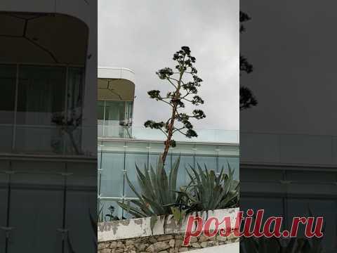 На фотографии изображено здание с большими стеклянными окнами и частью балкона, на котором растут высокий кактус и другие растения. Фон неба серый, вероятно, пасмурная погода.