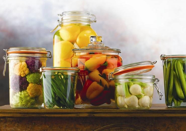 На изображении видны стеклянные банки с маринованными овощами. В банках заметны разные виды овощей, такие как огурцы, перцы, цветная капуста и другие. Банки закрыты металлическими зажимами для герметичности.