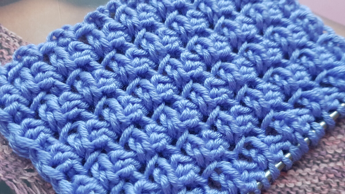 На изображении синяя вязаная вещь с ярко выраженным тиснением. Тиснение создаёт текстуру, состоящую из множества детально выделенных петель.