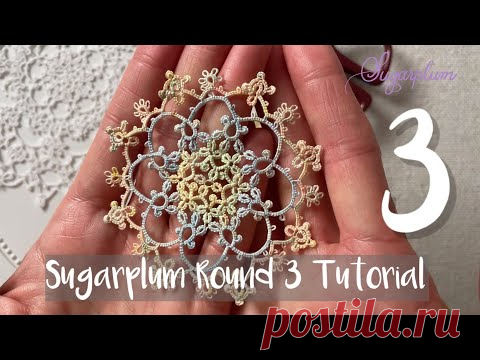 На фотографии изображена рука человека, держащая украшение или элемент декора, выполненный техникой фриволите. Это круглая вязаная поделка с лаконичным узором, предположительно, это может быть частью обучающего туториала по рукоделию "Sugarplum Round 3". Фон изображения нейтральный, элементы визуального дизайна указывают на использование в образовательных целях, вероятно, связанных с сайтом postila.ru.