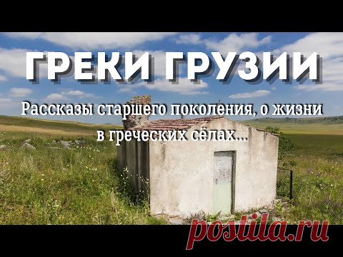 На изображении представлен текст на фоне пейзажа. Текст гласит: "ГРЕКИ ГРУЗИИ Рассказы старшего поколения, о жизни в греческих селах...". Изображение, возможно, представляет обложку книги или плакат, связанный с культурой или историей греков в Грузии. На заднем плане видна маленькая заброшенная постройка на фоне поля и голубого неба с облаками.